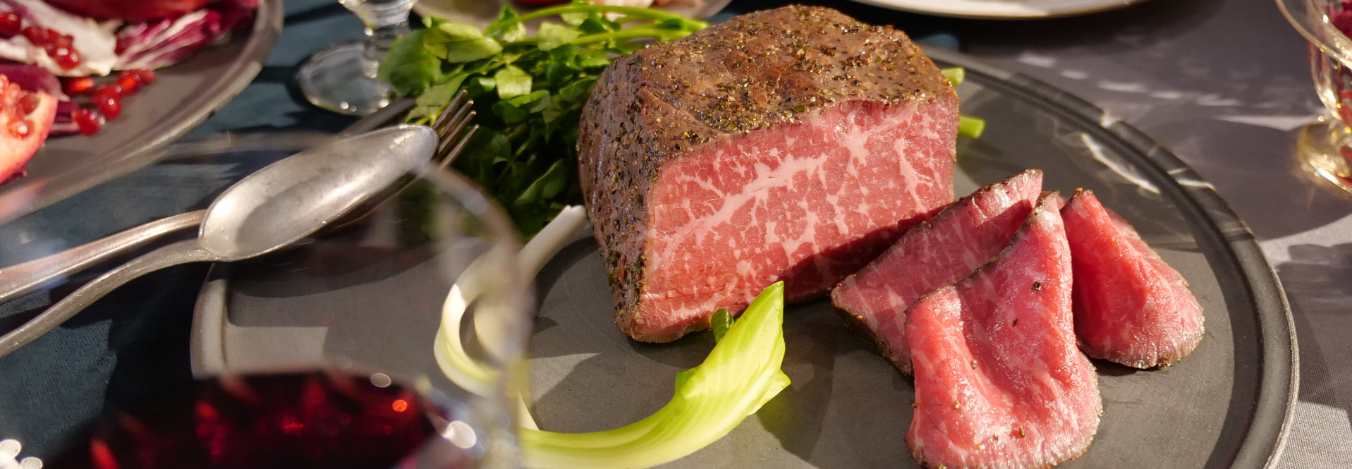 和牛と経産牛を掛け合わせた、ローストビーフのための牛肉といっても過言ではない牛を使用しています。肉質のきめ細やかさと、柔らかさにこだわっているため、未経産の雌牛に限定しています。牝牛の脂肪には不飽和脂肪酸が多く含まれているため、脂の融点が低く、体内で脂が溶け出しやすく、食べた後も脂っぽさが残らず、キレの良い食べ応えが味わえます。
