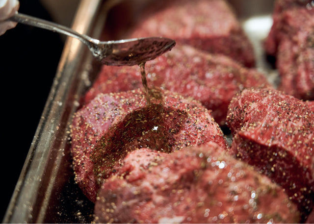 肉は旨みを最大限に引き出すために、3週間熟成をかけた肉のみを使用。 さらに肉を柔らかく、旨味を肉に染み込ませるために、オリジナルのマリネ手法で24時間熟成します。味ごとに違う厳選された調味料が肉に染み込みます。 全てハンドメイドで職人が仕込んでいるため、個体差に合わせた調味料の微調整を可能としています。